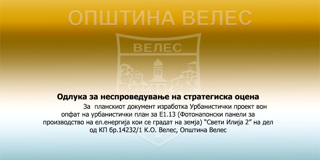 За  планскиот документ изработка Урбанистички проект вон опфат на урбанистички план за Е1.13 (Фотонапонски панели за производство на ел.енергија кои се градат на земја)