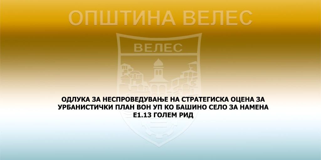 За планскиот документ изработка на Урбанистички проект вон опфат на урбанистички план за Е1.13 (Фотонапонски панели за производство на ел.енергија кои се градат на земја) „Голем Рид” на дел од КП бр.108/1, К.О. Башино село вон град, Општина Велес koj се носи согласно Законот за урбанистичко планирање (Сл.весник на Р.С.Македонија бр. 32/20 и 111/23), не е потребно да се спроведе стратегиска оцена на влијанието врз животната средина согласно член 65 од Законот за животната средина.