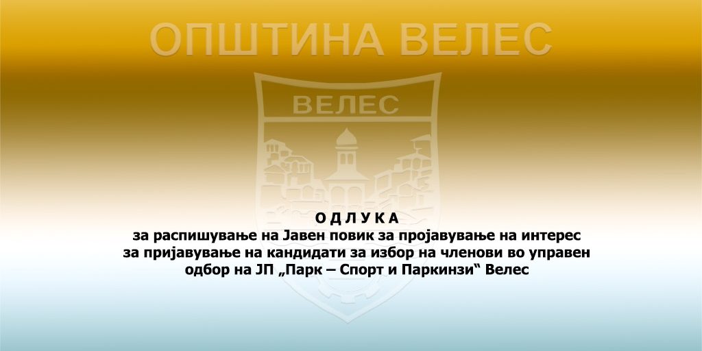 Општина Велес распишува Јавен повик за пројавување на интерес за пријавување на кандидати за избор на членови во управен одбор на ЈП „Парк – Спорт и Паркинзи“ Велес.