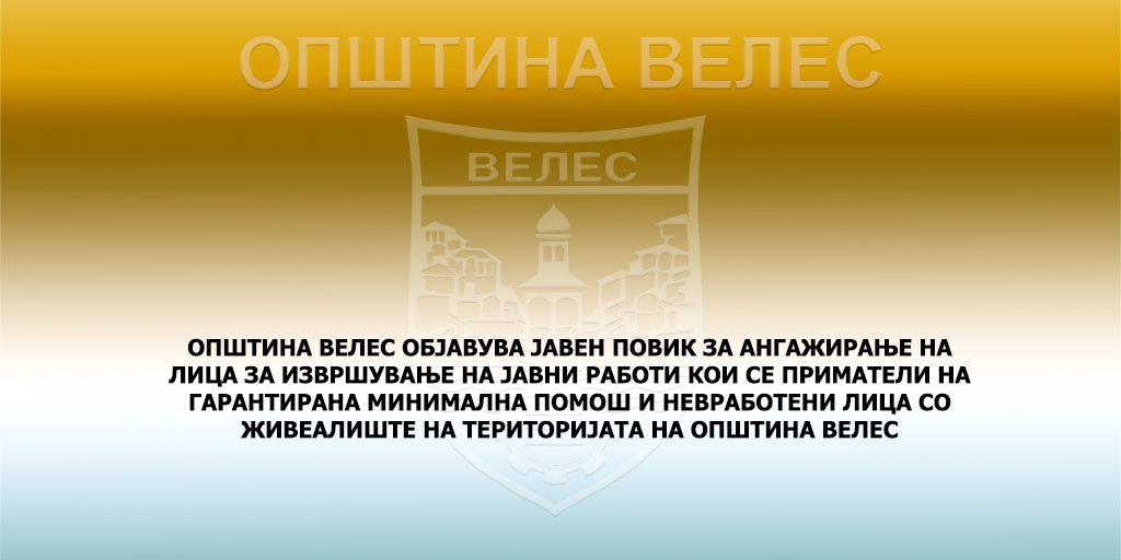 Општина Велес објавува Јавен Повик за ангажирање на лица за извршување на јавни работи кои се приматели на гарантирана минимална помош и невработени лица со живеалиште на територијата на Општина Велес, а врз основа на Програмата за активностите на Општина Велес во областа на заштита на животната средина во 2025 год.под арх.бр. 25-4761/18 од 29.11.2024 год. Согласно планот за јавни работи за 2025 година изготвен од страна на надлежните служби, Општина Велес има потреба од 10 лица за извршување на јавни работи во времетраење од 10 месеци.