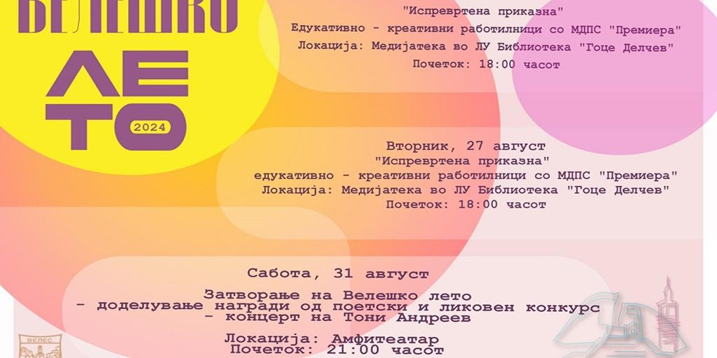 Во сабота, на 31 август, ќе се заокружи „Велешко лето 2024“ со доделување на награди од поетски и ликовен конкурс, а посетителите ќе имаат можност да се забавуваат на концерт на Тони Андреев. Настанот ќе се одржи во Амфитеатарот во 21 часот.