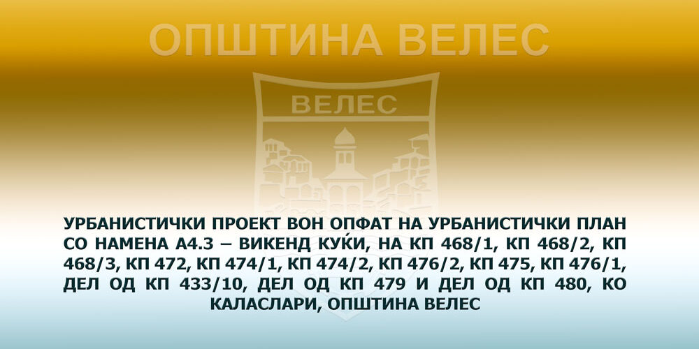 ПОТВРДА ЗА ОДОБРУВАЊЕ НА УРБАНИСТИЧКИ ПРОЕКТ ВОН ОПФАТ НА УРБАНИСТИЧКИ ПЛАН СО НАМЕНА А4.3 – ВИКЕНД КУЌИ, НА КП 468/1, КП 468/2, КП 468/3, КП 472, КП 474/1, КП 474/2, КП 476/2, КП 475, КП 476/1, ДЕЛ ОД КП 433/10, ДЕЛ ОД КП 479 И ДЕЛ ОД КП 480, КO КАЛАСЛАРИ, ОПШТИНА ВЕЛЕС