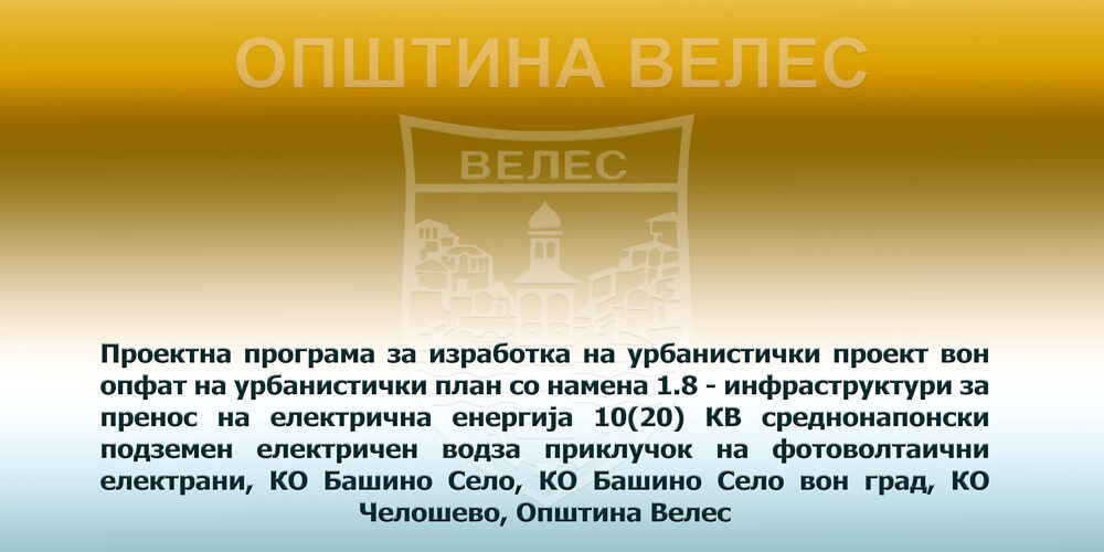 Проектна програма за изработка на урбанистички проект вон опфат на урбанистички план со намена 1.8 – инфраструктури за пренос на електрична енергија 10(20) КВ среднонапонски подземен електричен водза приклучок на фотоволтаични електрани, КО Башино Село, КО Башино Село вон град, КО Челошево, Општина Велес.