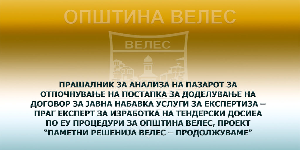 Со цел отпочнување на постапка за доделување на договор за јавна набавка за УСЛУГИ која ќе се спроведува согласно Практичниот водич за процедури за доделување на договори за ЕУ надворешни активности (ПРАГ 2020) како и  ИПА прирачникот за набавки, а кои ќе бидат дефинирани во тендерската документација – УСЛУГИ (SERVICES) УСЛУГИ за изработка на тендерски досиеа по ЕУ процедури на Општина Велес како имплементатор, во рамки на проектот  ,,Паметни Решенија Велес – продолжуваме”,