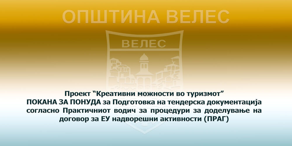 Согласно Одлуката од градоначалникот на општина Велес бр.08-2593/1 од 19.05.2022 за потребите на проектот “Креативни можности во туризмот”, се одобрува доделување нa договор за јавна набавка на услуги – Подготовка на тендерска документација.