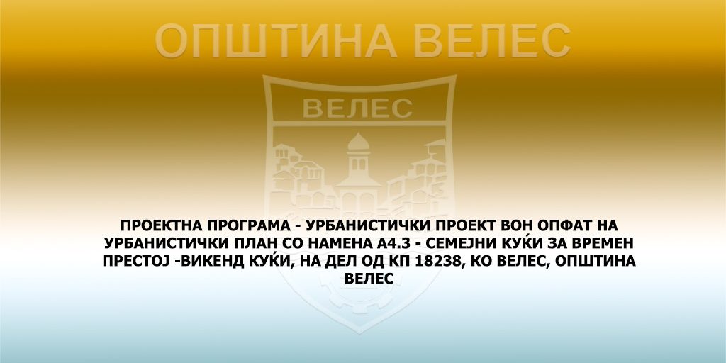 ПРОЕКТНА ПРОГРАМА – УРБАНИСТИЧКИ ПРОЕКТ ВОН ОПФАТ НА УРБАНИСТИЧКИ ПЛАН СО НАМЕНА А4.3 – СЕМЕЈНИ КУЌИ ЗА ВРЕМЕН ПРЕСТОЈ -ВИКЕНД КУЌИ, НА ДЕЛ ОД КП 18238, КО ВЕЛЕС, ОПШТИНА ВЕЛЕС
