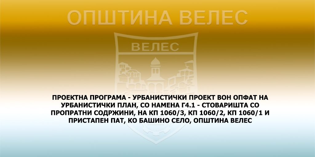 ПРОЕКТНА ПРОГРАМА – УРБАНИСТИЧКИ ПРОЕКТ ВОН ОПФАТ НА УРБАНИСТИЧКИ ПЛАН, СО НАМЕНА Г4.1 – СТОВАРИШТА СО ПРОПРАТНИ СОДРЖИНИ, НА КП 1060/3, КП 1060/2, КП 1060/1 И ПРИСТАПЕН ПАТ, КО БАШИНО СЕЛО, ОПШТИНА ВЕЛЕС