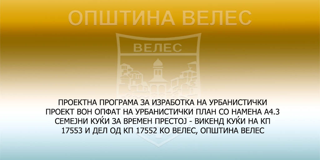 ПРОЕКТНА ПРОГРАМА ЗА ИЗРАБОТКА НА УРБАНИСТИЧКИ ПРОЕКТ ВОН ОПФАТ НА УРБАНИСТИЧКИ ПЛАН СО НАМЕНА А4.3 СЕМЕЈНИ КУЌИ ЗА ВРЕМЕН ПРЕСТОЈ – ВИКЕНД КУЌИ НА КП 17553 И ДЕЛ ОД КП 17552 КО ВЕЛЕС, ОПШТИНА ВЕЛЕС