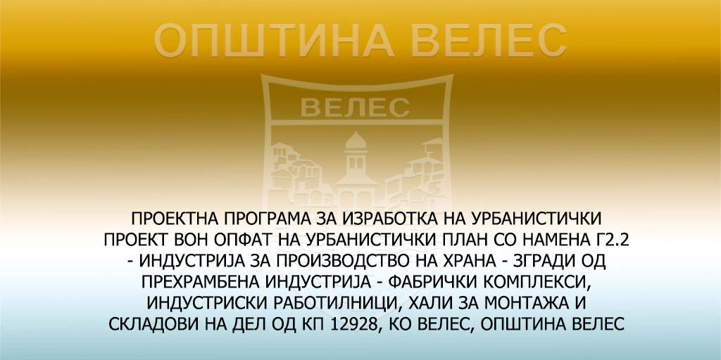 ПРОЕКТНА ПРОГРАМА ЗА ИЗРАБОТКА НА УРБАНИСТИЧКИ ПРОЕКТ ВОН ОПФАТ НА УРБАНИСТИЧКИ ПЛАН СО НАМЕНА Г2.2 – ИНДУСТРИЈА ЗА ПРОИЗВОДСТВО НА ХРАНА – ЗГРАДИ ОД ПРЕХРАМБЕНА ИНДУСТРИЈА – ФАБРИЧКИ КОМПЛЕКСИ, ИНДУСТРИСКИ РАБОТИЛНИЦИ, ХАЛИ ЗА МОНТАЖА И СКЛАДОВИ НА ДЕЛ ОД КП 12928, КО ВЕЛЕС, ОПШТИНА ВЕЛЕС