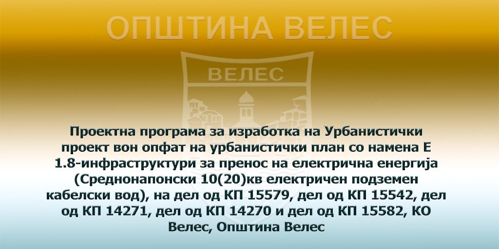 Проектна програма за изработка на Урбанистички проект вон опфат на урбанистички план со намена Е1.8-инфраструктури за пренос на електрична енергија (Среднонапонски 10(20)кв електричен подземен кабелски вод), на дел од КП 15579, дел од КП 15542, дел од КП 14271, дел од КП 14270 и дел од КП 15582, КО Велес, Општина Велес