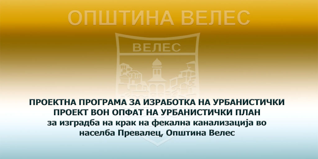 ПРОЕКТНА ПРОГРАМА ЗА ИЗРАБОТКА НА УРБАНИСТИЧКИ ПРОЕКТ ВОН ОПФАТ НА УРБАНИСТИЧКИ ПЛАН за изградба на крак на фекална канализација во населба Превалец, Општина Велес