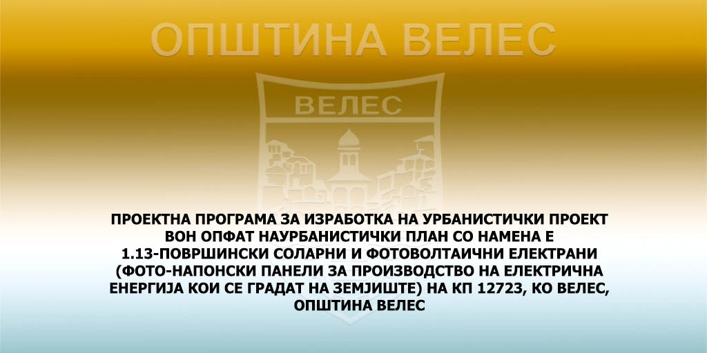 ПРОЕКТНА ПРОГРАМА ЗА ИЗРАБОТКА НА УРБАНИСТИЧКИ ПРОЕКТ ВОН ОПФАТ НАУРБАНИСТИЧКИ ПЛАН СО НАМЕНА Е 1.13-ПОВРШИНСКИ СОЛАРНИ И ФОТОВОЛТАИЧНИ ЕЛЕКТРАНИ (ФОТО-НАПОНСКИ ПАНЕЛИ ЗА ПРОИЗВОДСТВО НА ЕЛЕКТРИЧНА ЕНЕРГИЈА КОИ СЕ ГРАДАТ НА ЗЕМЈИШТЕ) НА КП 12723, КО ВЕЛЕС, ОПШТИНА ВЕЛЕС