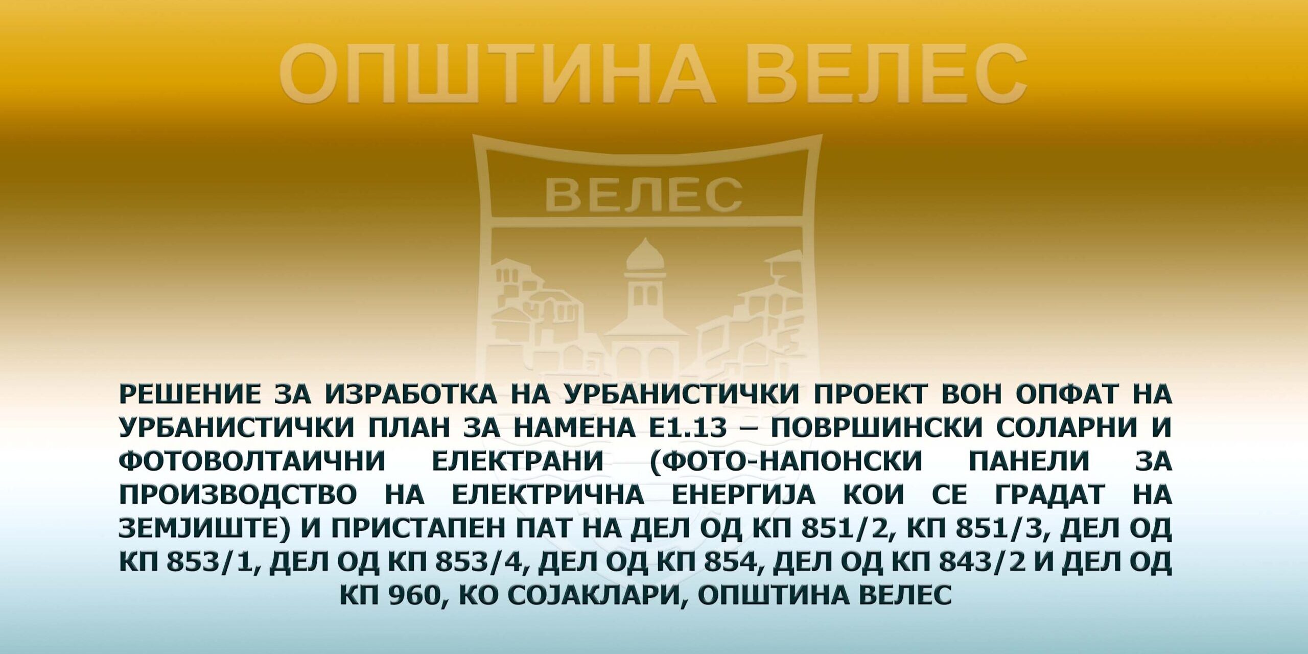 РЕШЕНИЕ за изработка на Урбанистички проект вон опфат на урбанистички план за намена Е1.13 – Површински соларни и фотоволтаични електрани (фото-напонски панели за производство на електрична енергија кои се градат на земјиште) и пристапен пат на дел од КП 851/2, КП 851/3, дел од КП 853/1, дел од КП 853/4, дел од КП 854, дел од КП 843/2 и дел од КП 960, КО Сојаклари, Општина Велес