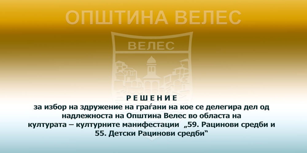 Со оваа Решение се врши избор на здружение на граѓани на кое се делегира дел од надлежноста на Општина Велес во областа на културата –културните манифестации  „59. Рацинови средби и 55. Детски Рацинови средби“ .
