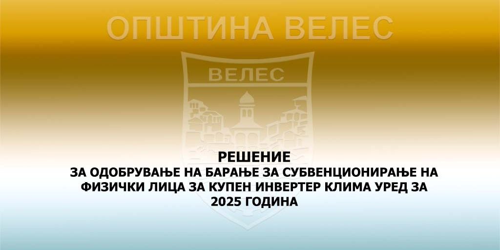 Согласно Правилник за изменување на Правилникот за условите, начинот и постапката за користење на финансиски средства од Буџетот на Општина Велес за субвенционирање на физички лица од подрачјето на Општина Велес за купен инвертер клима уред („Службен гласник на Општина Велес“ бр.08/22,06/24), а врз основа на Одлуката за определување на максимален износ за доделување на поединечна субвенција на физичко лице за купен инвертер клима уред за 2025 година („Службен гласник на Општина Велес“ бр. 03/25) Градоначалникот на Општина Велес, Марко Колев, по предлог на Комисијата за спроведување на постапка за субвенционирање на физички лица за купен инвертер клима уред, донесе