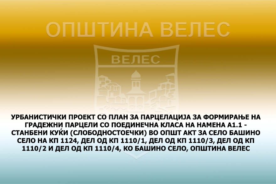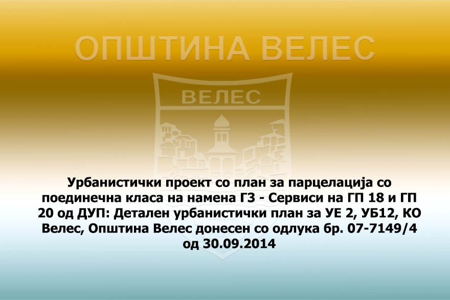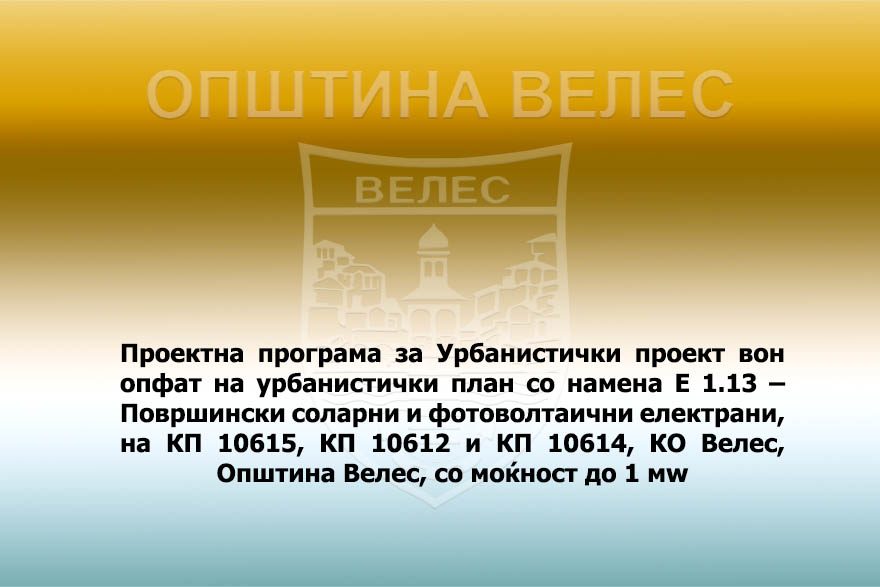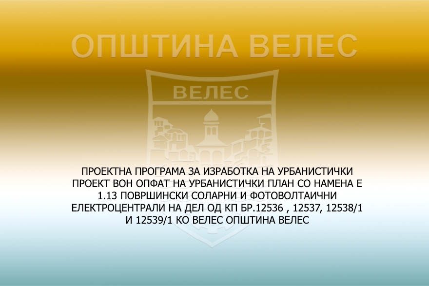 ПРОЕКТНА ПРОГРАМА ЗА ИЗРАБОТКА НА УРБАНИСТИЧКИ ПРОЕКТ ВОН ОПФАТ НА УРБАНИСТИЧКИ ПЛАН СО НАМЕНА Е1.13 ПОВРШИНСКИ СОЛАРНИ И ФОТОВОЛТАИЧНИ ЕЛЕКТРОЦЕНТРАЛИ НА ДЕЛ ОД КП БР.12536 , 12537, 12538/1 И 12539/1 КО ВЕЛЕС ОПШТИНА ВЕЛЕС