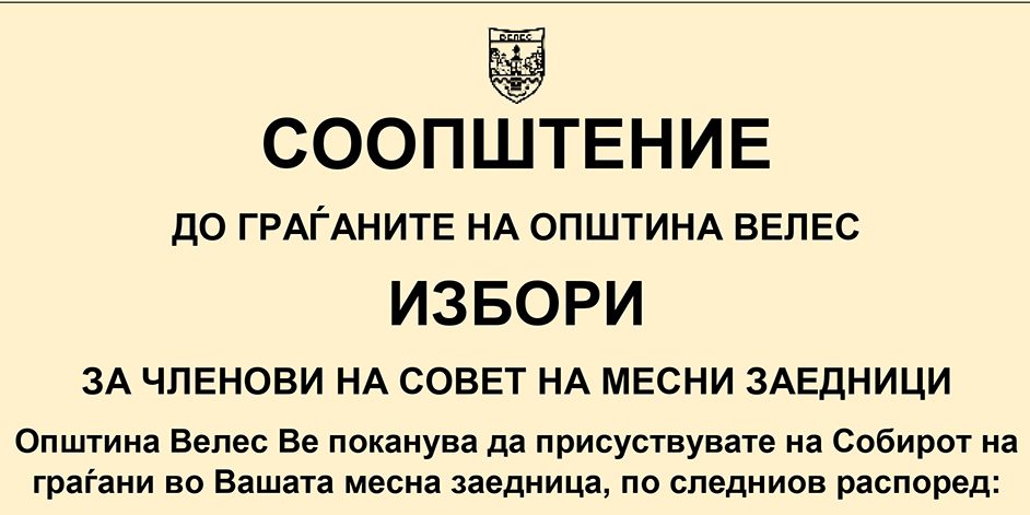СООПШТЕНИЕ ДО ГРАЃАНИТЕ НА ОПШТИНА ВЕЛЕС ИЗБОРИ ЗА ЧЛЕНОВИ НА СОВЕТ НА МЕСНИ ЗАЕДНИЦИ