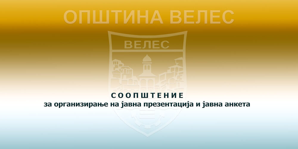 Јавната анкета и Јавната презентација по Предлог Детален урбанистички план за дел од УЕ 3, дел од УБ 24 и УЕ10 дел од УБ 52, Градски парк, Општина Велес, ќе се спроведе со објавување Соопштение во информацискиот систем е-урбанизам како и во две јавни гласила и со излагање на Предлог планот во Граѓанскиот сервис центар на Општина Велес.