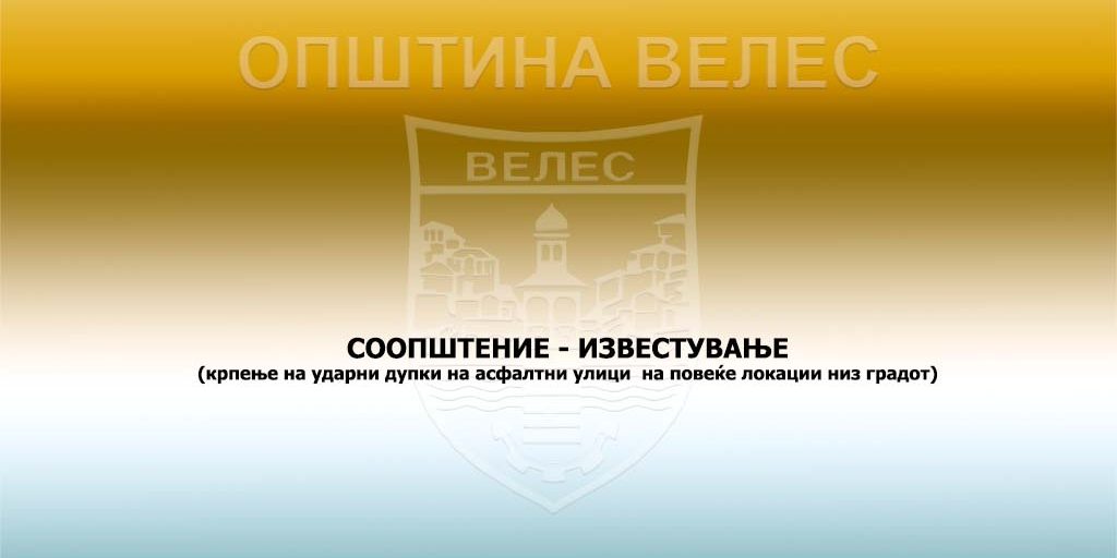 Се известуваат граѓаните на општина Велес дека во текот на следните денови ќе се вршат градежни активности – крпење на ударни дупки на асфалтни улици на повеќе локации низ градот .