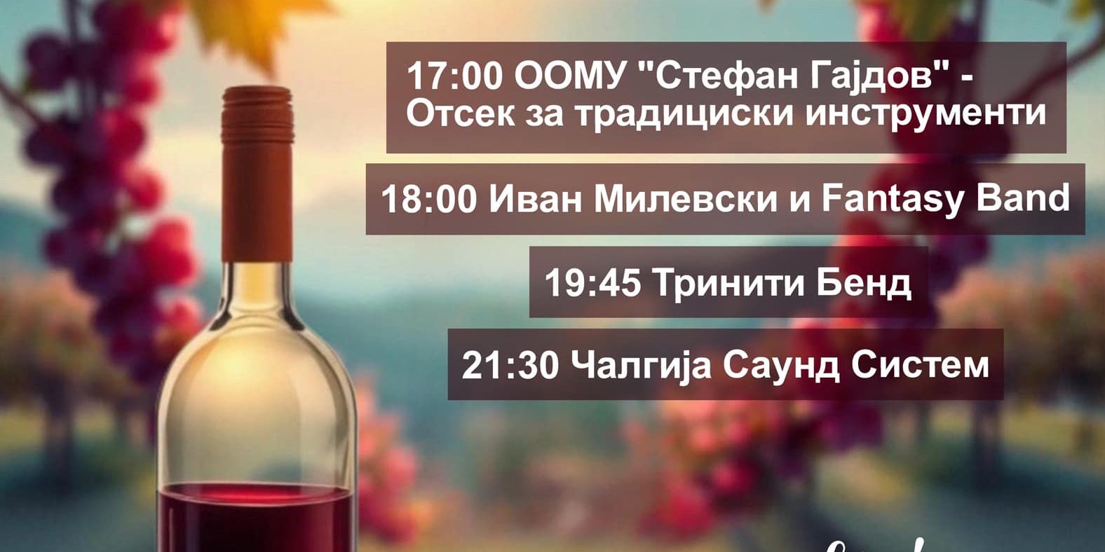 Општина Велес и годинава приредува заедничко одбележување на празникот на лозјето и виното Свети Трифун. Граѓаните ќе имаат можност да дегустираат добри вина од локалните винарии и да вкусат традиционални велешки специјалитети. За забавата да биде на високо ниво ќе се погрижат учениците од отсекот за традиционални инструменти при ООМУ „Стефан Гајдов“ , Иван Милевски и Fantasy Band, Тринити Бенд и Чалгија Саунд Систем.