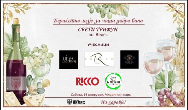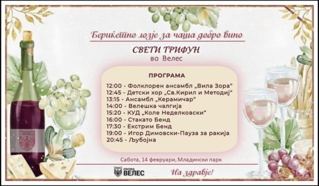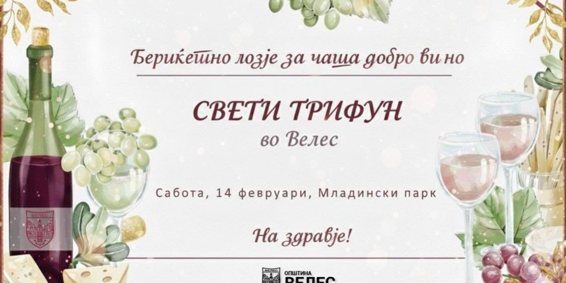 Општина Велес ги поканува сите граѓани на заедничко чествување на Свети Трифун на 14 февруари, во Младински парк со почеток во 12:00 часот.