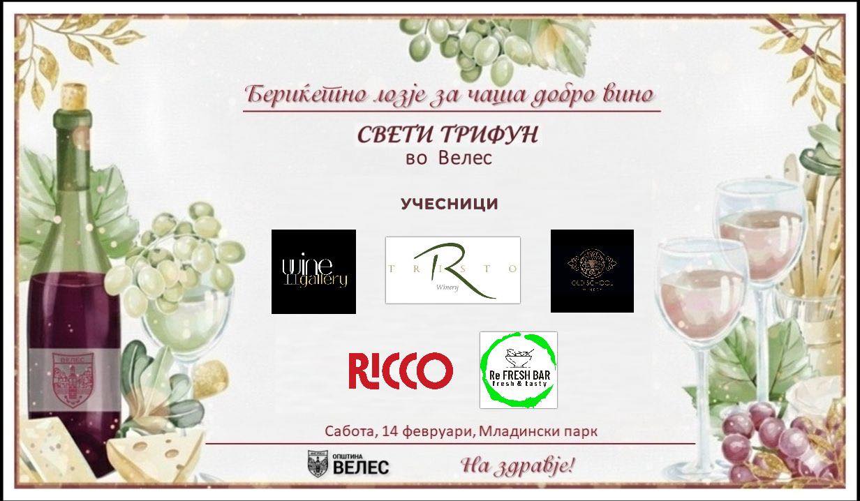 Заедничко чествување на Свети Трифун во Младински парк. Општина Велес организира пригодна програма за одбележување на празникот, заштитникот на лозјата и виното, со одлична музика, вкусна храна и квалитетни вина.