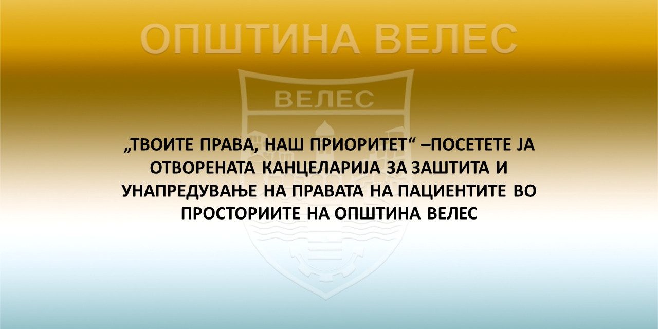 Општина Велес ја информира јавноста дека се отвори Канцеларија на Комисијата за унапредување на правата на пациентите, со цел обезбедување поголема заштита, информираност и поддршка за сите граѓани во остварувањето на нивните здравствени права.