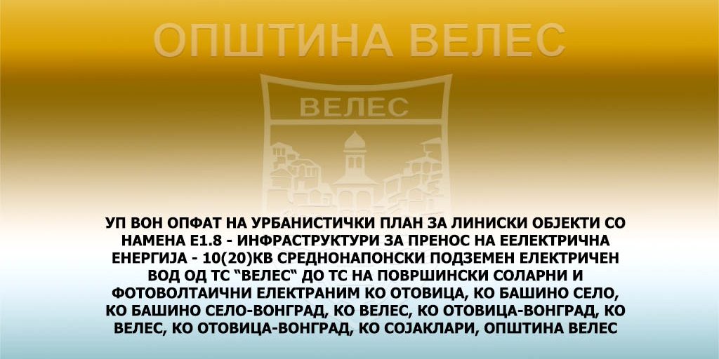 УП ВОН ОПФАТ НА УРБАНИСТИЧКИ ПЛАН ЗА ЛИНИСКИ ОБЈЕКТИ СО НАМЕНА Е1.8 – ИНФРАСТРУКТУРИ ЗА ПРЕНОС НА ЕЕЛЕКТРИЧНА ЕНЕРГИЈА – 10(20)КВ СРЕДНОНАПОНСКИ ПОДЗЕМЕН ЕЛЕКТРИЧЕН ВОД ОД ТС “ВЕЛЕС“ ДО ТС НА ПОВРШИНСКИ СОЛАРНИ И ФОТОВОЛТАИЧНИ ЕЛЕКТРАНИМ КО ОТОВИЦА, КО БАШИНО СЕЛО, КО БАШИНО СЕЛО-ВОНГРАД, КО ВЕЛЕС, КО ОТОВИЦА-ВОНГРАД, КО ВЕЛЕС, КО ОТОВИЦА-ВОНГРАД, КО СОЈАКЛАРИ, ОПШТИНА ВЕЛЕС