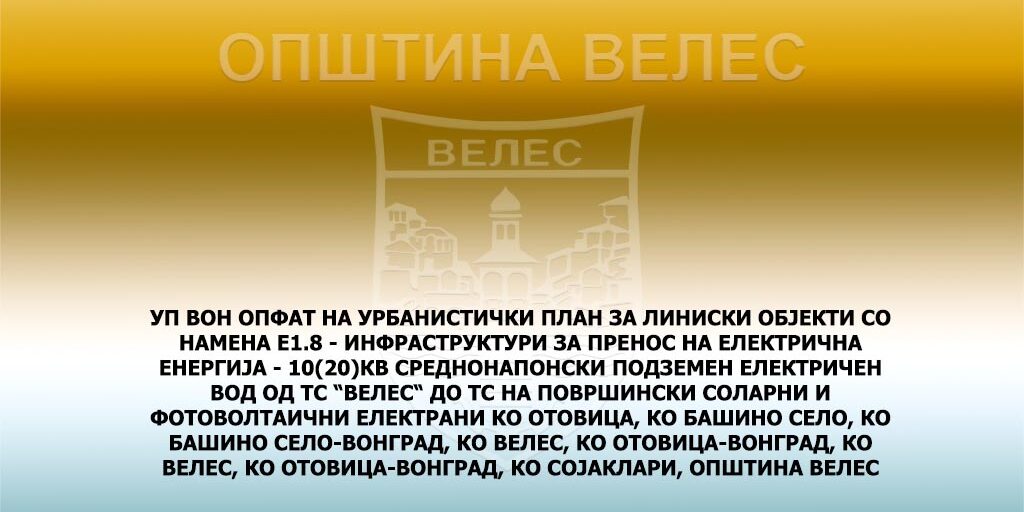 УП ВОН ОПФАТ НА УРБАНИСТИЧКИ ПЛАН ЗА ЛИНИСКИ ОБЈЕКТИ СО НАМЕНА Е1.8 – ИНФРАСТРУКТУРИ ЗА ПРЕНОС НА ЕЛЕКТРИЧНА ЕНЕРГИЈА – 10(20)КВ СРЕДНОНАПОНСКИ ПОДЗЕМЕН ЕЛЕКТРИЧЕН ВОД ОД ТС “ВЕЛЕС“ ДО ТС НА ПОВРШИНСКИ СОЛАРНИ И ФОТОВОЛТАИЧНИ ЕЛЕКТРАНИ КО ОТОВИЦА, КО БАШИНО СЕЛО, КО БАШИНО СЕЛО-ВОНГРАД, КО ВЕЛЕС, КО ОТОВИЦА-ВОНГРАД, КО ВЕЛЕС, КО ОТОВИЦА-ВОНГРАД, КО СОЈАКЛАРИ, ОПШТИНА ВЕЛЕС