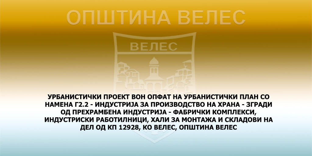 УРБАНИСТИЧКИ ПРОЕКТ ВОН ОПФАТ НА УРБАНИСТИЧКИ ПЛАН СО НАМЕНА Г2.2 – ИНДУСТРИЈА ЗА ПРОИЗВОДСТВО НА ХРАНА – ЗГРАДИ ОД ПРЕХРАМБЕНА ИНДУСТРИЈА – ФАБРИЧКИ КОМПЛЕКСИ, ИНДУСТРИСКИ РАБОТИЛНИЦИ, ХАЛИ ЗА МОНТАЖА И СКЛАДОВИ НА ДЕЛ ОД КП 12928, КО ВЕЛЕС, ОПШТИНА ВЕЛЕС