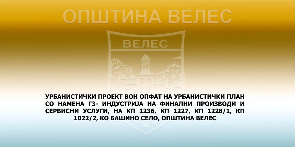УРБАНИСТИЧКИ ПРОЕКТ ВОН ОПФАТ НА УРБАНИСТИЧКИ ПЛАН СО НАМЕНА Г3- ИНДУСТРИЈА НА ФИНАЛНИ ПРОИЗВОДИ И СЕРВИСНИ УСЛУГИ, НА КП 1236, КП 1227, КП 1228/1, КП 1022/2, КО БАШИНО СЕЛО, ОПШТИНА ВЕЛЕС