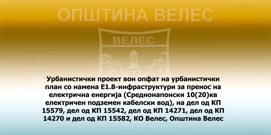 Урбанистички проект вон опфат на урбанистички план со намена Е1.8-инфраструктури за пренос на електрична енергија (Среднонапонски 10(20)кв електричен подземен кабелски вод), на дел од КП 15579, дел од КП 15542, дел од КП 14271, дел од КП 14270 и дел од КП 15582, КО Велес, Општина Велес