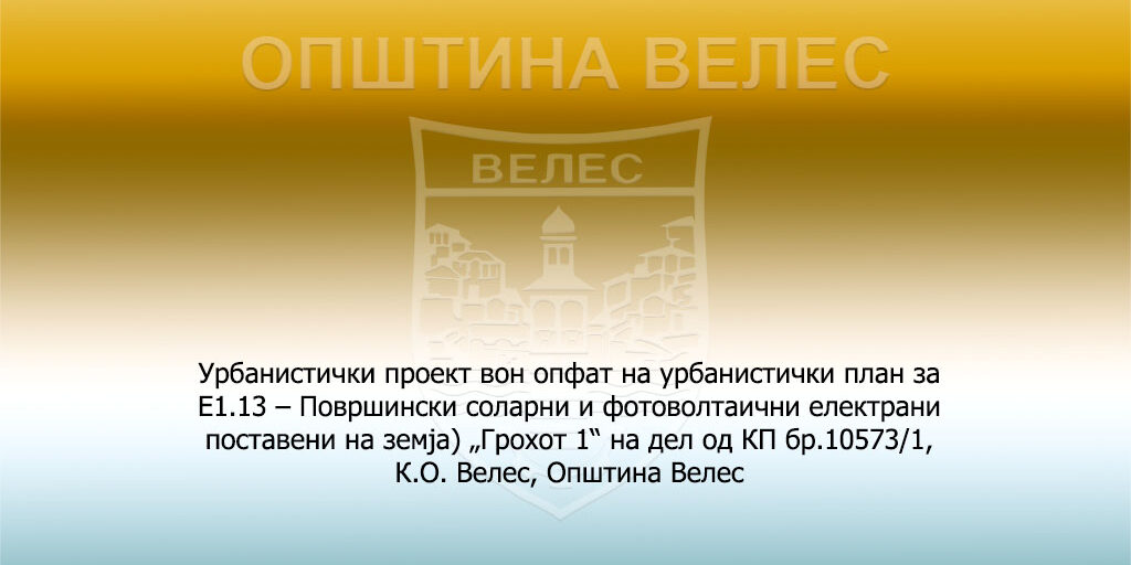 Урбанистички проект вон опфат на урбанистички план за Е1.13 – Површински соларни и фотоволтаични електрани поставени на земја) „Грохот 1“ на дел од КП бр.10573/1, К.О. Велес, Општина Велес