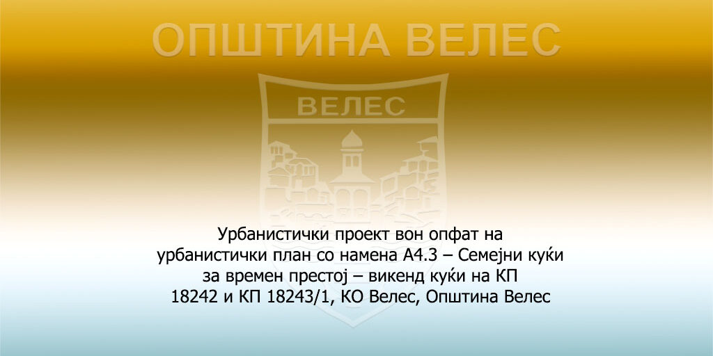 Урбанистички проект вон опфат на урбанистички план со намена А4.3 – Семејни куќи за времен престој – викенд куќи на КП 18242 и КП 18243/1, КО Велес, Општина Велес