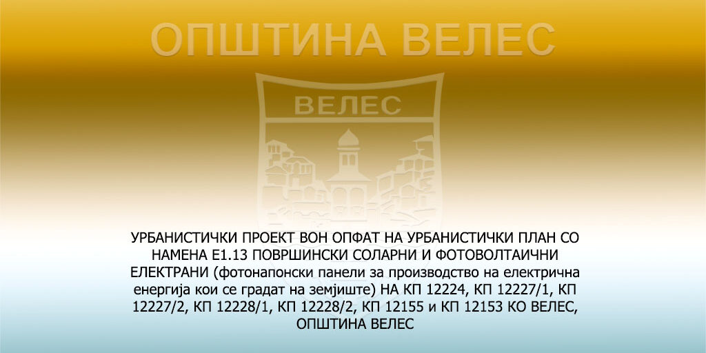 УРБАНИСТИЧКИ ПРОЕКТ ВОН ОПФАТ НА УРБАНИСТИЧКИ ПЛАН СО НАМЕНА Е1.13 ПОВРШИНСКИ СОЛАРНИ И ФОТОВОЛТАИЧНИ ЕЛЕКТРАНИ (фотонапонски панели за производство на електрична енергија кои се градат на земјиште) НА КП 12224, КП 12227/1, КП 12227/2, КП 12228/1, КП 12228/2, КП 12155 и КП 12153 КО ВЕЛЕС, ОПШТИНА ВЕЛЕС