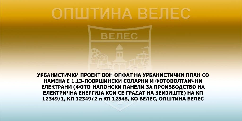 УРБАНИСТИЧКИ ПРОЕКТ ВОН ОПФАТ НА УРБАНИСТИЧКИ ПЛАН СО НАМЕНА Е 1.13-ПОВРШИНСКИ СОЛАРНИ И ФОТОВОЛТАИЧНИ ЕЛЕКТРАНИ (ФОТО-НАПОНСКИ ПАНЕЛИ ЗА ПРОИЗВОДСТВО НА ЕЛЕКТРИЧНА ЕНЕРГИЈА КОИ СЕ ГРАДАТ НА ЗЕМЈИШТЕ) НА КП 12349/1, КП 12349/2 и КП 12348, КО ВЕЛЕС, ОПШТИНА ВЕЛЕС