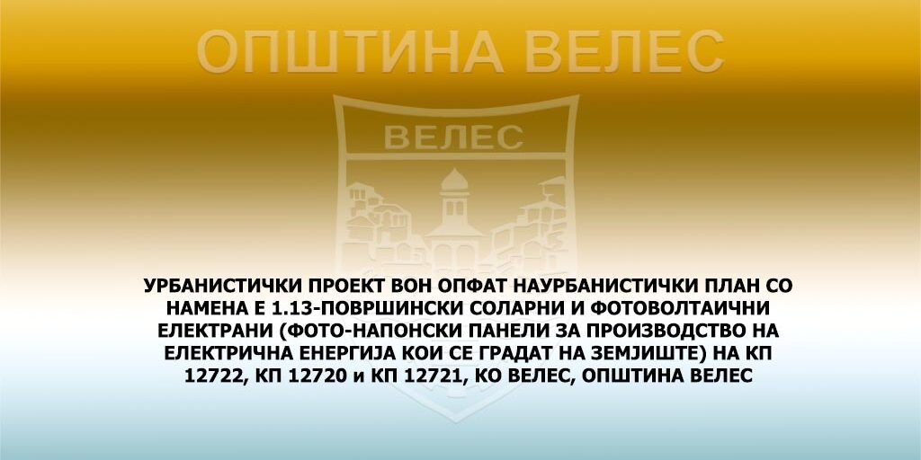 УРБАНИСТИЧКИ ПРОЕКТ ВОН ОПФАТ НАУРБАНИСТИЧКИ ПЛАН СО НАМЕНА Е 1.13-ПОВРШИНСКИ СОЛАРНИ И ФОТОВОЛТАИЧНИ ЕЛЕКТРАНИ (ФОТО-НАПОНСКИ ПАНЕЛИ ЗА ПРОИЗВОДСТВО НА ЕЛЕКТРИЧНА ЕНЕРГИЈА КОИ СЕ ГРАДАТ НА ЗЕМЈИШТЕ) НА КП 12722, КП 12720 и КП 12721, КО ВЕЛЕС, ОПШТИНА ВЕЛЕС