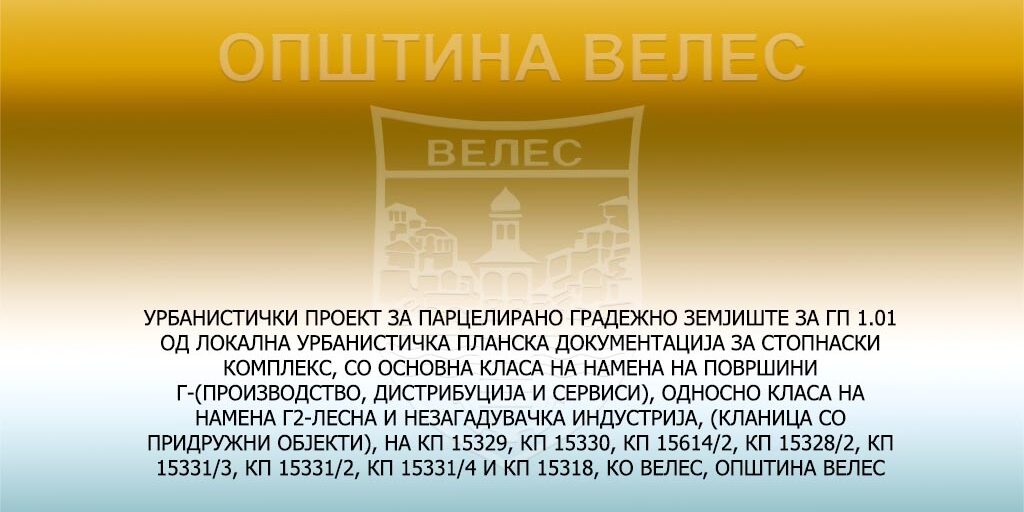 УРБАНИСТИЧКИ ПРОЕКТ ЗА ПАРЦЕЛИРАНО ГРАДЕЖНО ЗЕМЈИШТЕ ЗА ГП 1.01 ОД ЛОКАЛНА УРБАНИСТИЧКА ПЛАНСКА ДОКУМЕНТАЦИЈА ЗА СТОПНАСКИ КОМПЛЕКС, СО ОСНОВНА КЛАСА НА НАМЕНА НА ПОВРШИНИ Г-(ПРОИЗВОДСТВО, ДИСТРИБУЦИЈА И СЕРВИСИ), ОДНОСНО КЛАСА НА НАМЕНА Г2-ЛЕСНА И НЕЗАГАДУВАЧКА ИНДУСТРИЈА, (КЛАНИЦА СО ПРИДРУЖНИ ОБЈЕКТИ), НА КП 15329, КП 15330, КП 15614/2, КП 15328/2, КП 15331/3, КП 15331/2, КП 15331/4 И КП 15318, КО ВЕЛЕС, ОПШТИНА ВЕЛЕС