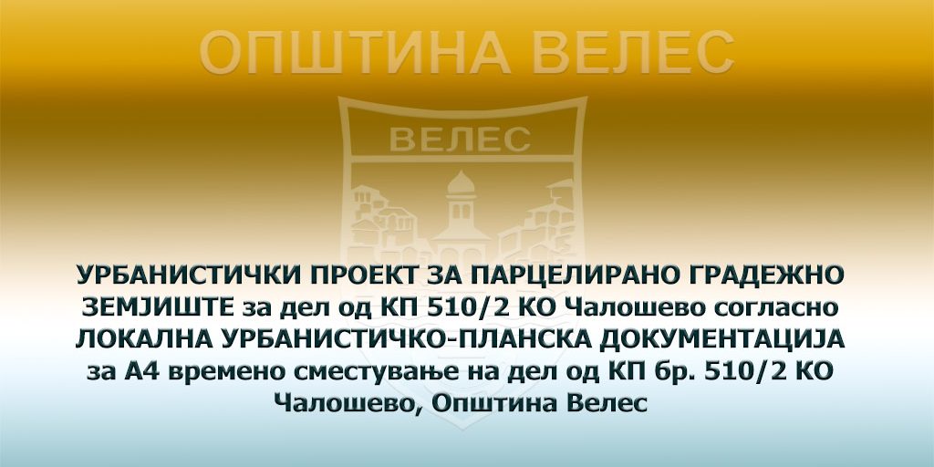 УРБАНИСТИЧКИ ПРОЕКТ ЗА ПАРЦЕЛИРАНО ГРАДЕЖНО ЗЕМЈИШТЕ за дел од КП 510/2 КО Чалошево согласно ЛОКАЛНА УРБАНИСТИЧКО-ПЛАНСКА ДОКУМЕНТАЦИЈА за А4 времено сместување на дел од КП бр. 510/2 КО Чалошево, Општина Велес