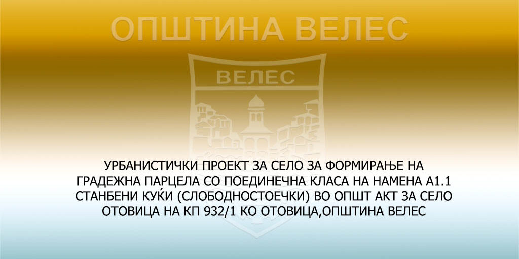 УРБАНИСТИЧКИ ПРОЕКТ ЗА СЕЛО ЗА ФОРМИРАЊЕ НА ГРАДЕЖНА ПАРЦЕЛА СО ПОЕДИНЕЧНА КЛАСА НА НАМЕНА А1.1 СТАНБЕНИ КУЌИ (СЛОБОДНОСТОЕЧКИ) ВО ОПШТ АКТ ЗА СЕЛО ОТОВИЦА НА КП 932/1 КО ОТОВИЦА,ОПШТИНА ВЕЛЕС