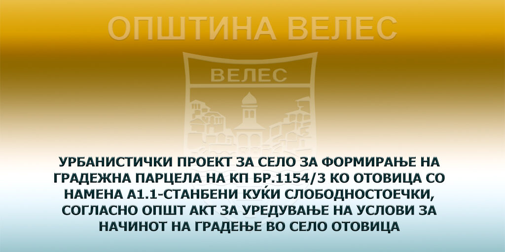 УРБАНИСТИЧКИ ПРОЕКТ ЗА СЕЛО ЗА ФОРМИРАЊЕ НА ГРАДЕЖНА ПАРЦЕЛА НА КП БР.1154/3 КО ОТОВИЦА СО НАМЕНА А1.1-СТАНБЕНИ КУЌИ СЛОБОДНОСТОЕЧКИ, СОГЛАСНО ОПШТ АКТ ЗА УРЕДУВАЊЕ НА УСЛОВИ ЗА НАЧИНОТ НА ГРАДЕЊЕ ВО СЕЛО ОТОВИЦА