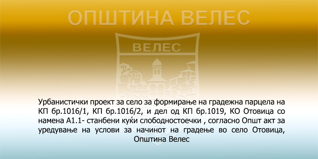 УРБАНИСТИЧКИ ПРОЕКТ ЗА СЕЛО ЗА ФОРМИРАЊЕ НА ГРАДЕЖНА ПАРЦЕЛА НА КП БР.1016/1, КП БР.1016/2, И ДЕЛ ОД КП БР.1019, КО ОТОВИЦА СО НАМЕНА А1.1- СТАНБЕНИ КУЌИ СЛОБОДНОСТОЕЧКИ , СОГЛАСНО ОПШТ АКТ ЗА УРЕДУВАЊЕ НА УСЛОВИ ЗА НАЧИНОТ НА ГРАДЕЊЕ ВО СЕЛО ОТОВИЦА, ОПШТИНА ВЕЛЕС