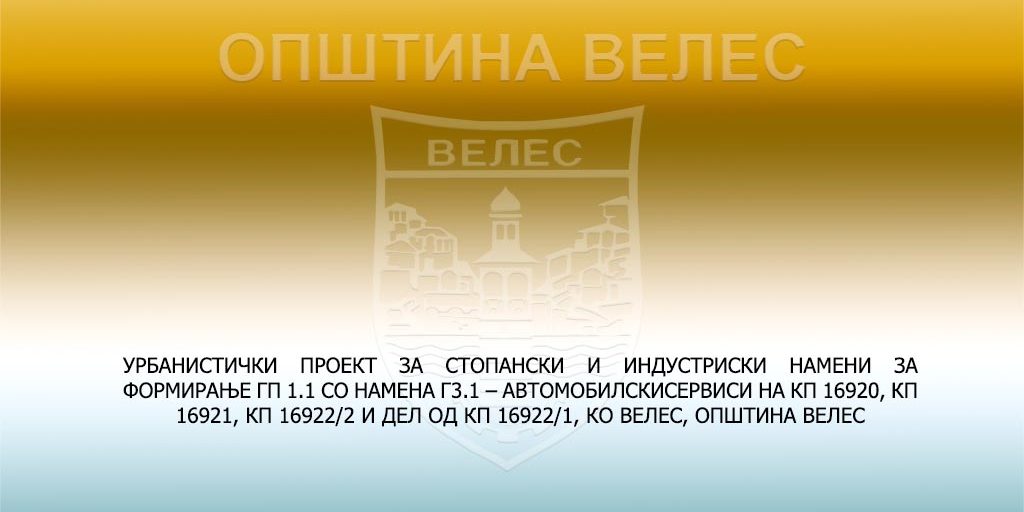 УРБАНИСТИЧКИ ПРОЕКТ ЗА СТОПАНСКИ И ИНДУСТРИСКИ НАМЕНИ ЗА ФОРМИРАЊЕ ГП 1.1 СО НАМЕНА Г3.1 – АВТОМОБИЛСКИСЕРВИСИ НА КП 16920, КП 16921, КП 16922/2 И ДЕЛ ОД КП 16922/1, КО ВЕЛЕС, ОПШТИНА ВЕЛЕС