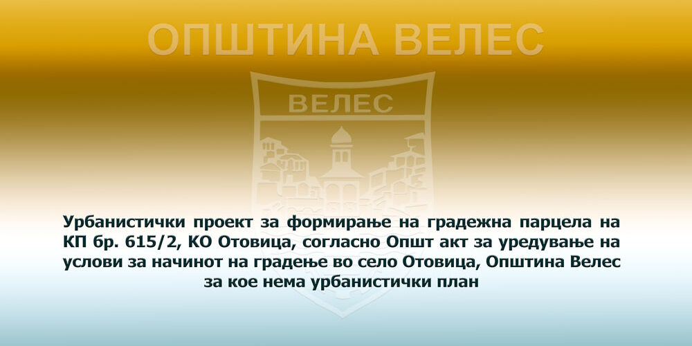 Урбанистички проект за формирање на градежнa парцелa на КП бр. 615/2, KO Отовица, согласно Општ акт за уредување на услови за начинот на градење во село Отовица, Општина Велес за кое нема урбанистички план.