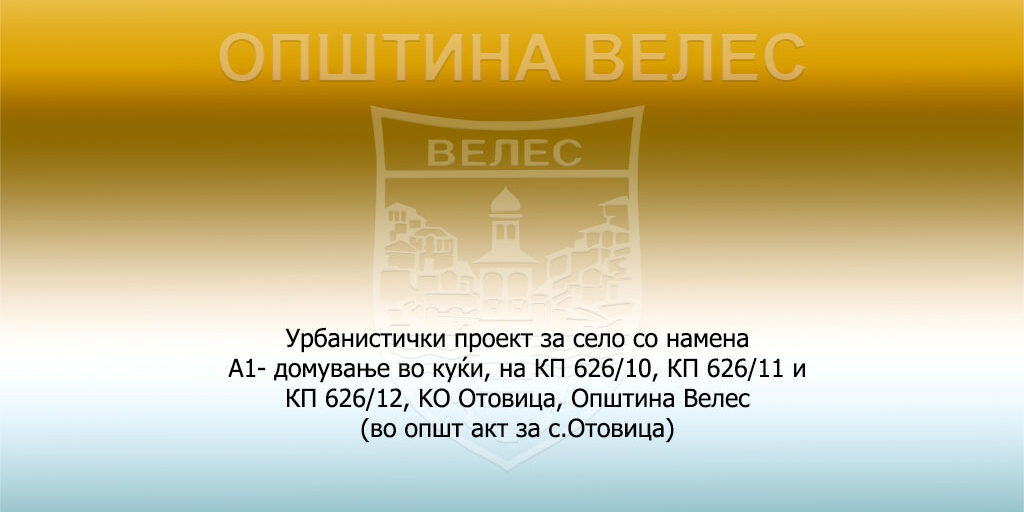 ПОТВРДА ЗА ОДОБРУВАЊЕ НА УРБАНИСТИЧКИ ПРОЕКТ ЗА СЕЛО СО НАМЕНА А1- ДОМУВАЊЕ ВО КУЌИ, НА КП 626/10, КП 626/11 И КП 626/12, KО ОТОВИЦА, ОПШТИНА ВЕЛЕС (ВО ОПШТ АКТ ЗА С.ОТОВИЦА)