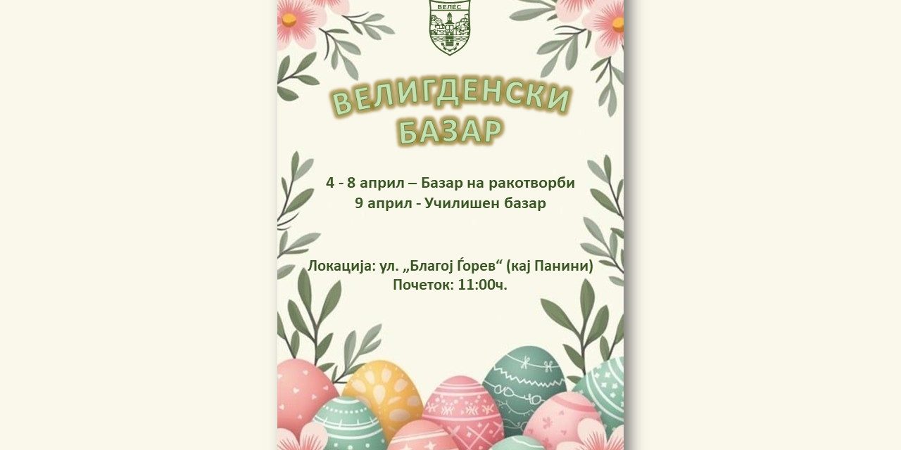 Во пресрет на Велигденски празници Општина Велес организира Велигденски базар. На тезгите пред Панини, велешките ракотворци ќе ги изложат своите рачни изработки. Граѓаните ќе имаат можност да си купат прекрасно изработени уникатни велигденски изработки.